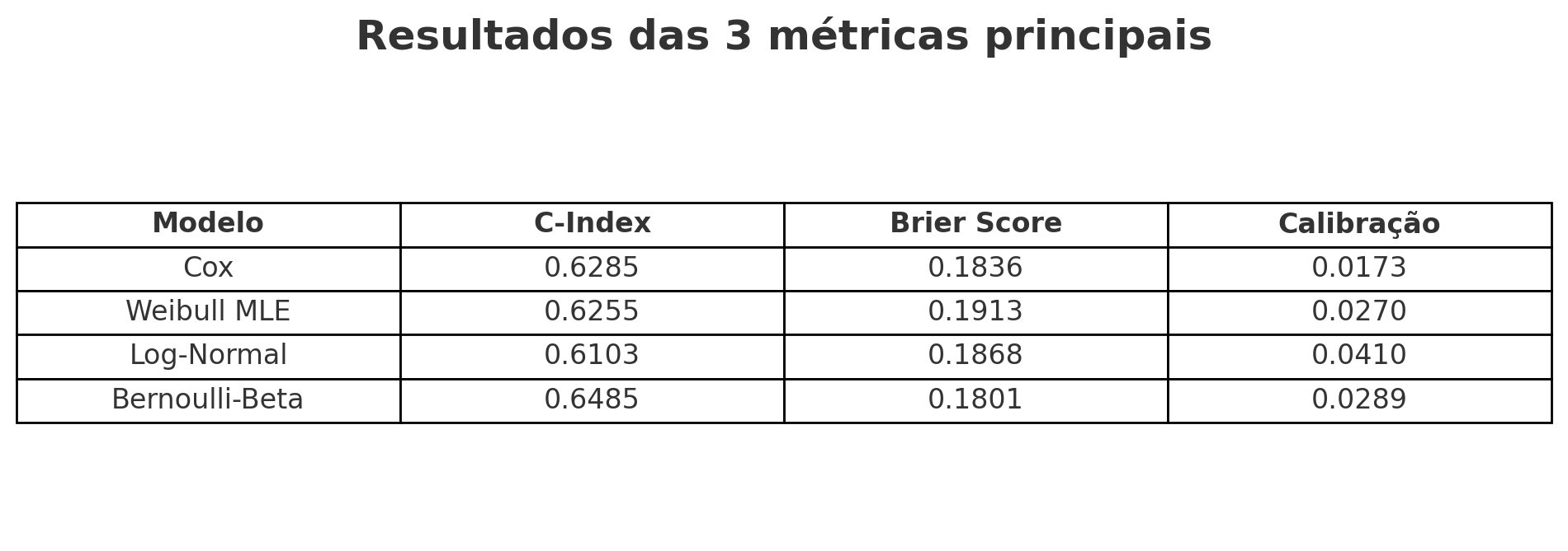 Em discriminação, a Bernoulli-Beta lidera, seguida por Cox e Weibull muito próximos, com Log-Normal atrás. Em acurácia global (Brier), a Bernoulli-Beta novamente é a melhor, com o Cox logo em seguida; o Weibull apresenta o pior desempenho. Em calibração, o destaque é o Cox, bastante alinhado às frequências observadas; Weibull e Bernoulli-Beta vêm na sequência, enquanto o Log-Normal exibe o maior desvio.