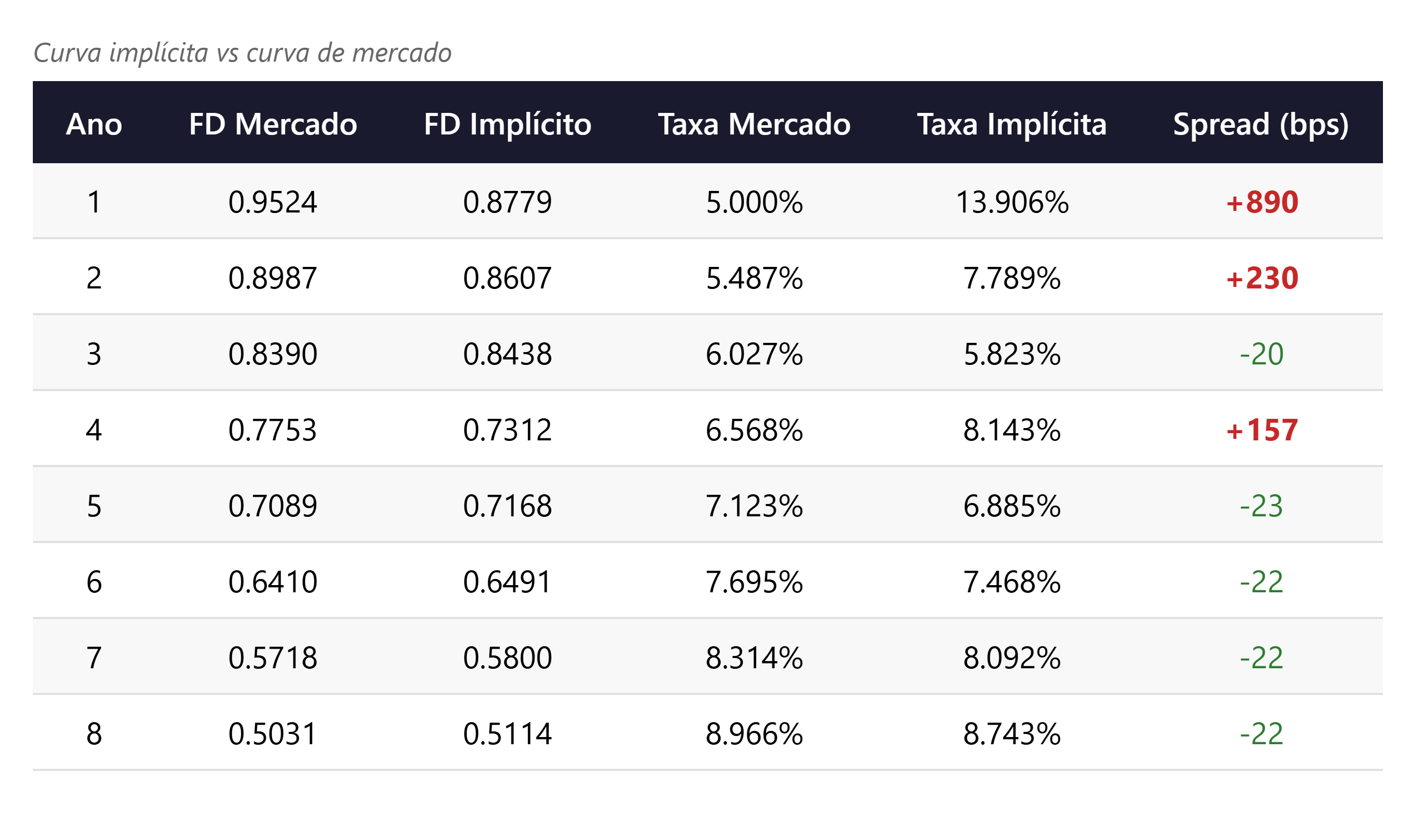 A curva de mercado é suave e crescente (5,0% a 9,0%), refletindo a estrutura de rendimentos dos títulos. A curva implícita diverge no curto prazo (+891 bps no ano 1, +230 bps no ano 2) e apresenta um desvio no ano 4 (+157 bps). Dos anos 5 a 8, as curvas convergem, com spreads entre -20 e -24 bps. O custo de dedicação se concentra nos prazos curtos, onde o universo de títulos é menos eficiente para cobertura.