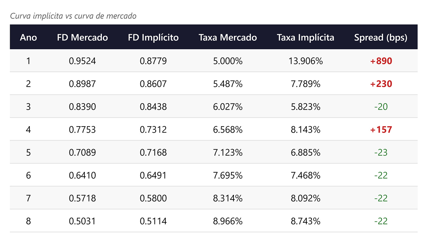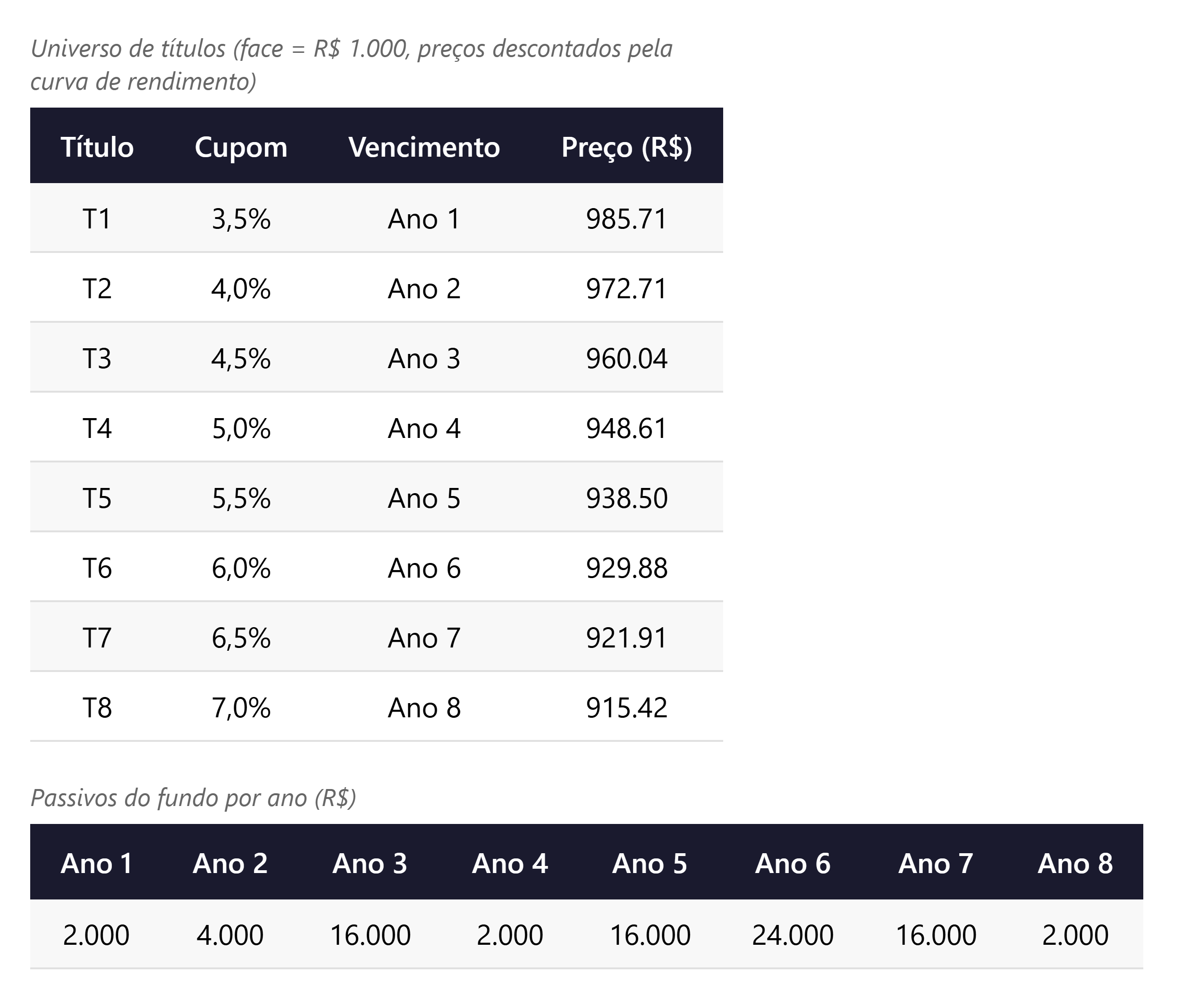 O fator de desconto para o ano 1 é 0,878, correspondendo a uma taxa spot implícita de 13,9%, enquanto a curva de mercado indica 5,0% para o mesmo prazo. Para os anos seguintes, as taxas implícitas situam-se entre 5,8% e 8,7%. A taxa do ano 1 é desproporcionalmente alta porque cobrir um passivo de curtíssimo prazo com títulos que também pagam cupons em períodos futuros é relativamente caro: parte do investimento “escoa” para períodos com menor necessidade. A curva implícita é uma função do universo de instrumentos disponíveis, não da curva de mercado livre, como observaram Dahl, Meeraus e Zenios (1993).