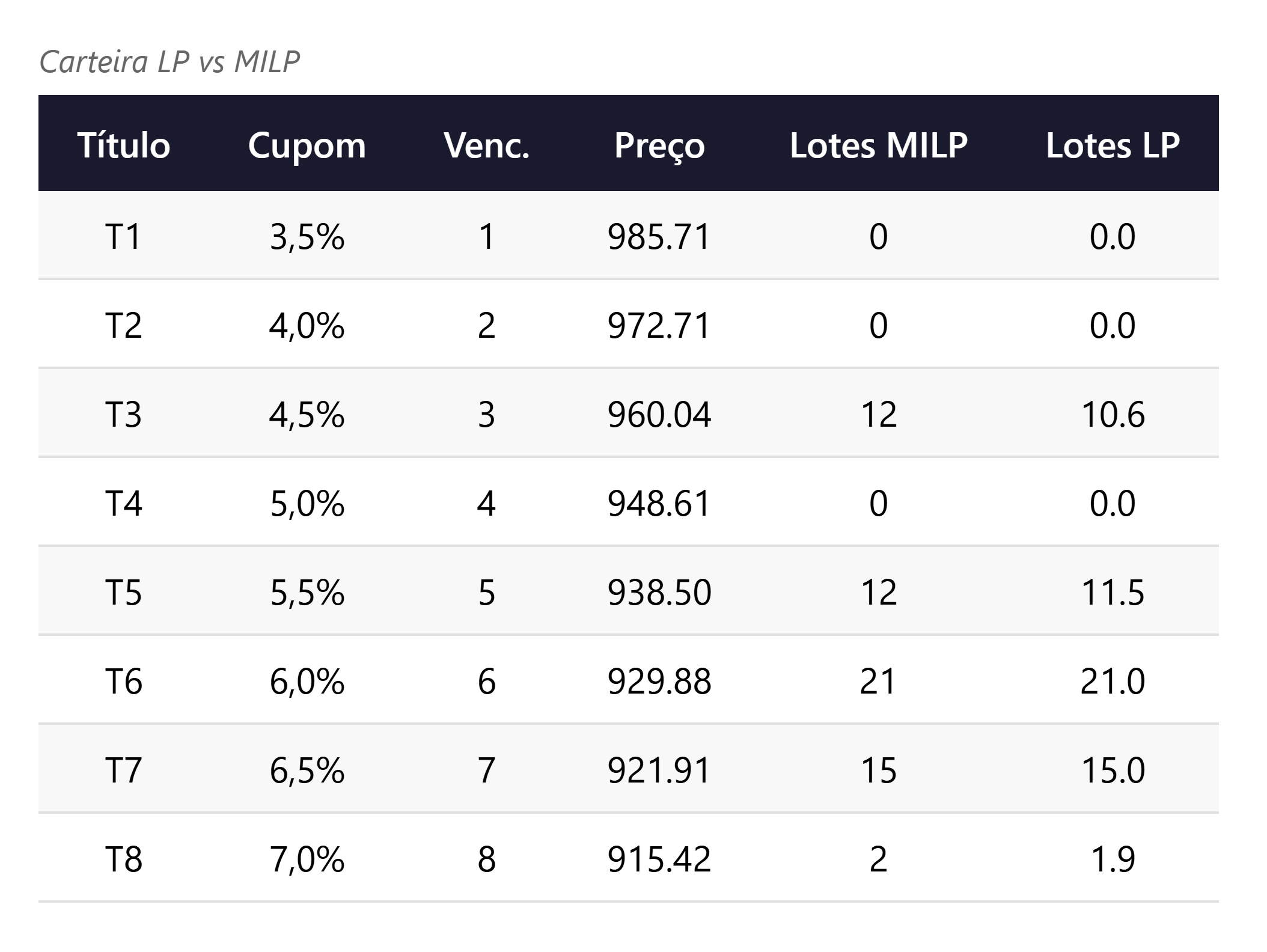 O resolvedor encontra a solução MILP ótima com custo de R$ 57.969 para passivos totais de R$ 82.000, selecionando 5 dos 8 títulos: 12 lotes de T3, 12 de T5, 21 de T6, 15 de T7 e 2 de T8. A relaxação LP encontra custo de R$ 57.514, resultando em um gap de integralidade de 0,79%. As soluções são qualitativamente semelhantes, com a LP usando frações de lotes para distribuir a cobertura de forma mais eficiente.