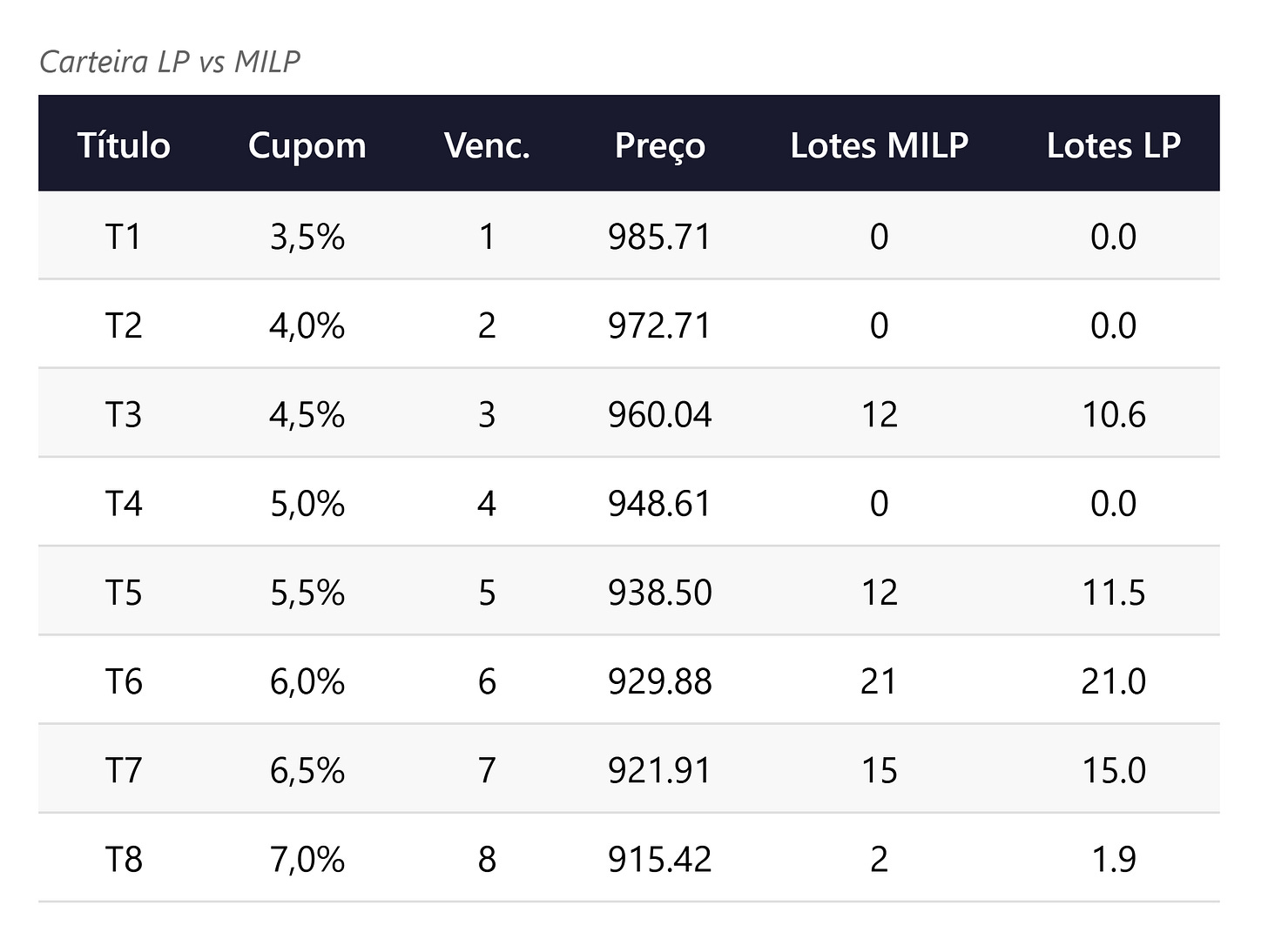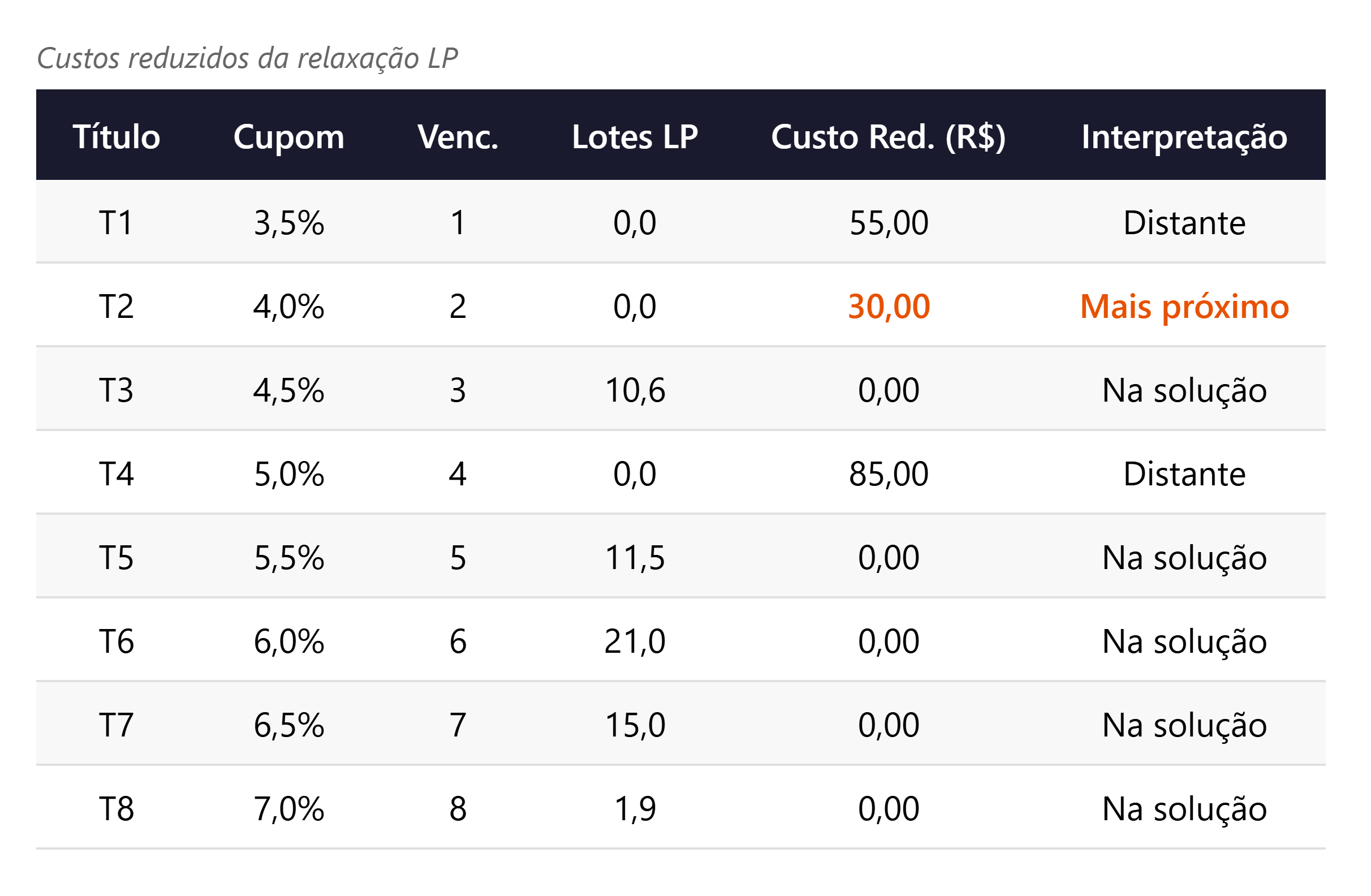 Quatro títulos ficam fora da solução LP: T1 (custo reduzido 66,09), T2 (34,95), T4 (98,38) e T7 (25,05). T7 é o mais próximo da fronteira de inclusão: seu preço precisaria cair cerca de R$ 25 para entrar na carteira. O gestor pode usar custos reduzidos como alertas para títulos que merecem atenção quando condições de mercado mudam.