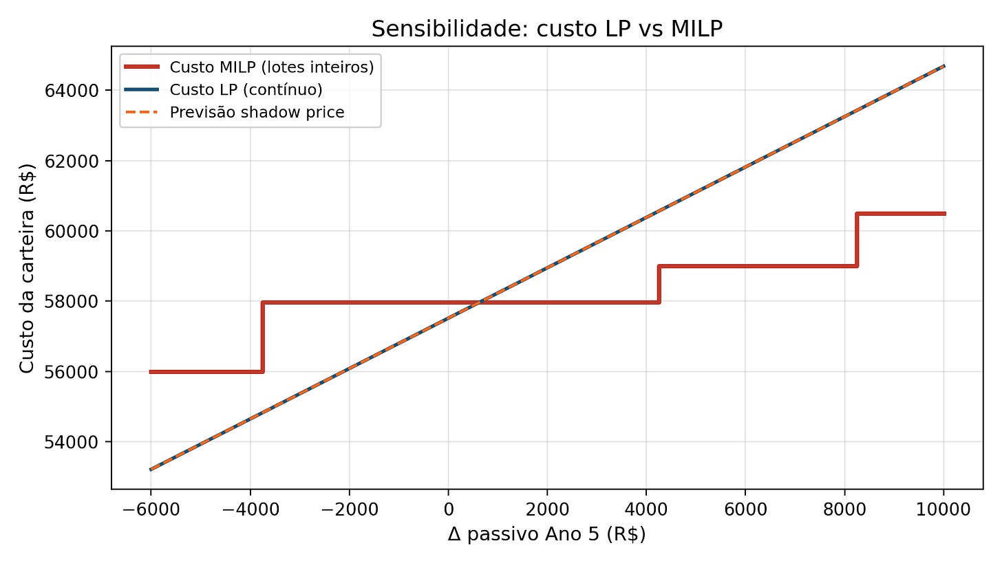 O contraste entre as duas abordagens fica evidente num exemplo concreto. Se o passivo do ano 5 aumenta em R$ 4.000 (de 16.000 para 20.000), o shadow price prevê um acréscimo de custo de π5 × 4.000 = 0,7499 × 4.000 ≈ R$ 3.000. Essa é a previsão linear da relaxação LP. Já a re-resolução do MILP mostra que o custo permanece em R$ 62.000, inalterado: a carteira inteira absorve a perturbação via surplus sem precisar ser reestruturada. O erro do shadow price é de R$ 3.000 (a previsão superestima porque assume que a carteira precisaria ser recomposta, quando na verdade o excedente de caixa já é suficiente). Quando a perturbação é ainda maior e ultrapassa a capacidade do surplus (por exemplo, Δ = +8.000), o MILP salta para R$ 63.000, enquanto o shadow price prevê R$ 67.058. Neste caso, o erro é de R$ 4.058, ou 6,5% do custo real.