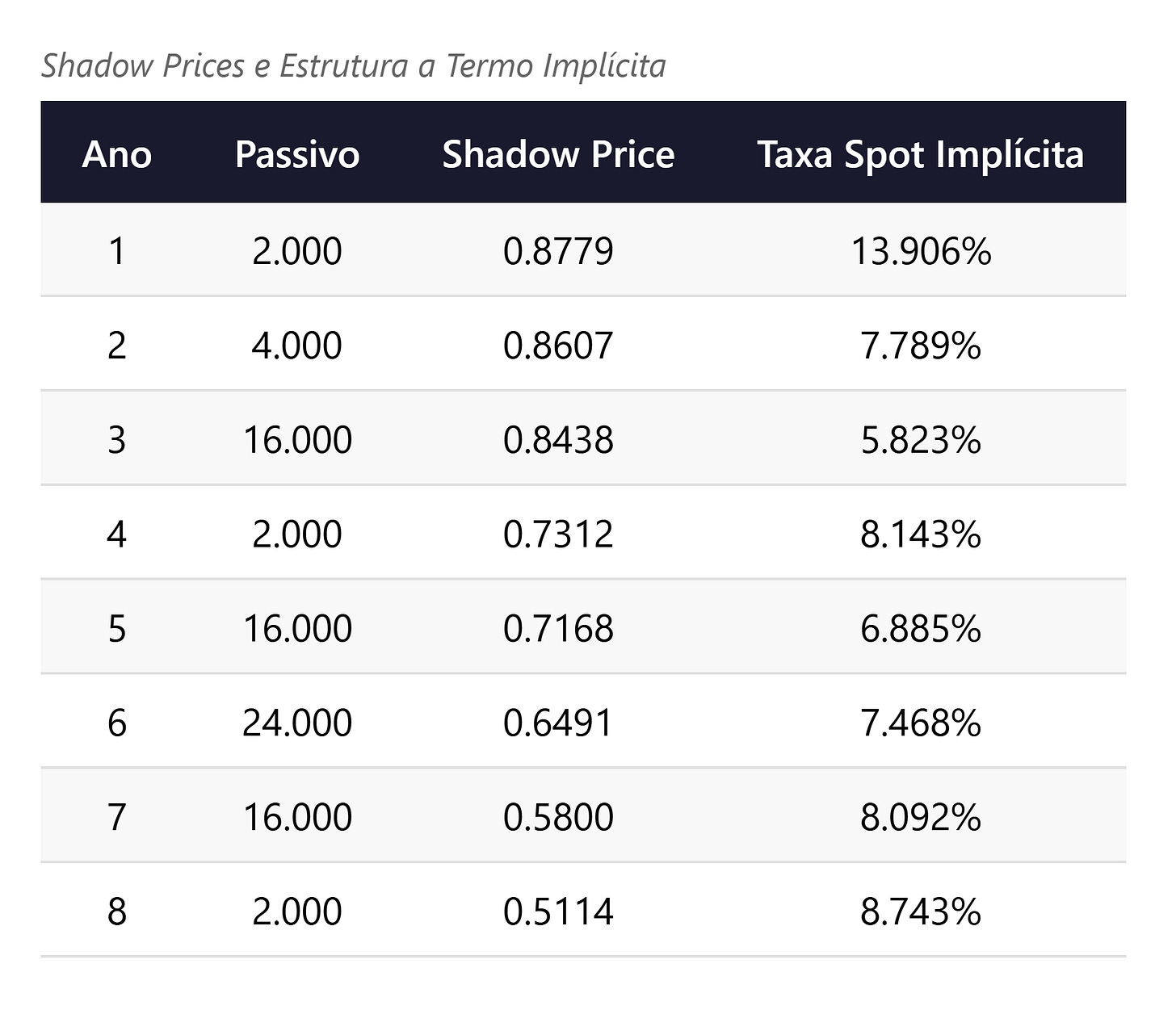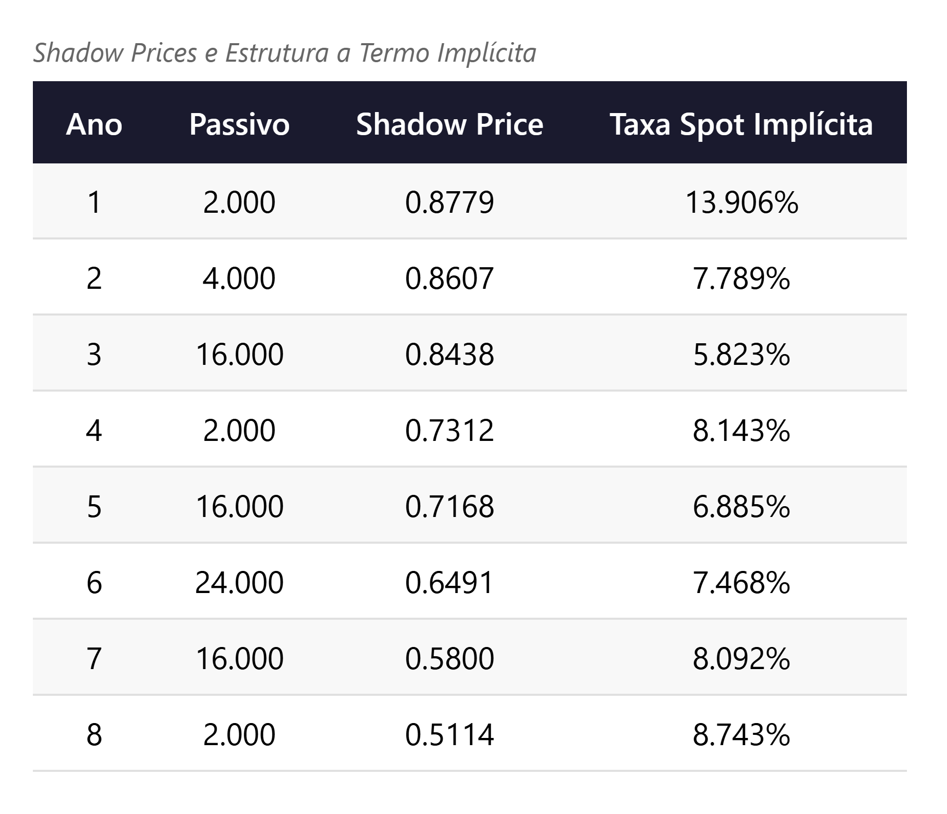 Pela teoria de dualidade em programação linear, cada restrição de igualdade possui uma variável dual associada, o shadow price (KOOPMANS, 1951). No modelo de dedicação, o shadow price πt da restrição de balanço do período t mede o acréscimo no custo mínimo da carteira caso o passivo aumente em uma unidade monetária. Essa grandeza é exatamente um fator de desconto implícito, do qual se extrai a taxa spot: