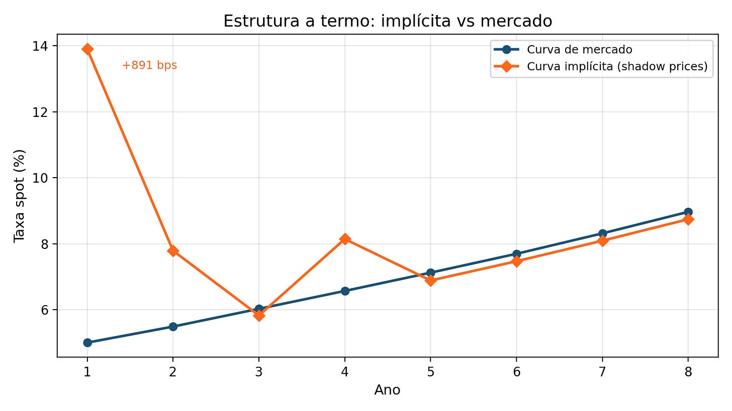 A formulação de carteiras dedicadas como programa linear, combinada com a análise dual, fornece mais do que uma carteira ótima. Os shadow prices das restrições de passivo revelam uma estrutura a termo implícita que diverge da curva de mercado nos prazos onde o universo de instrumentos é escasso (+891 bps no ano 1) e converge nos horizontes bem servidos. A comparação por extração iterativa permite ao gestor diagnosticar onde a carteira dedicada impõe custo adicional em relação ao “preço livre” do dinheiro.