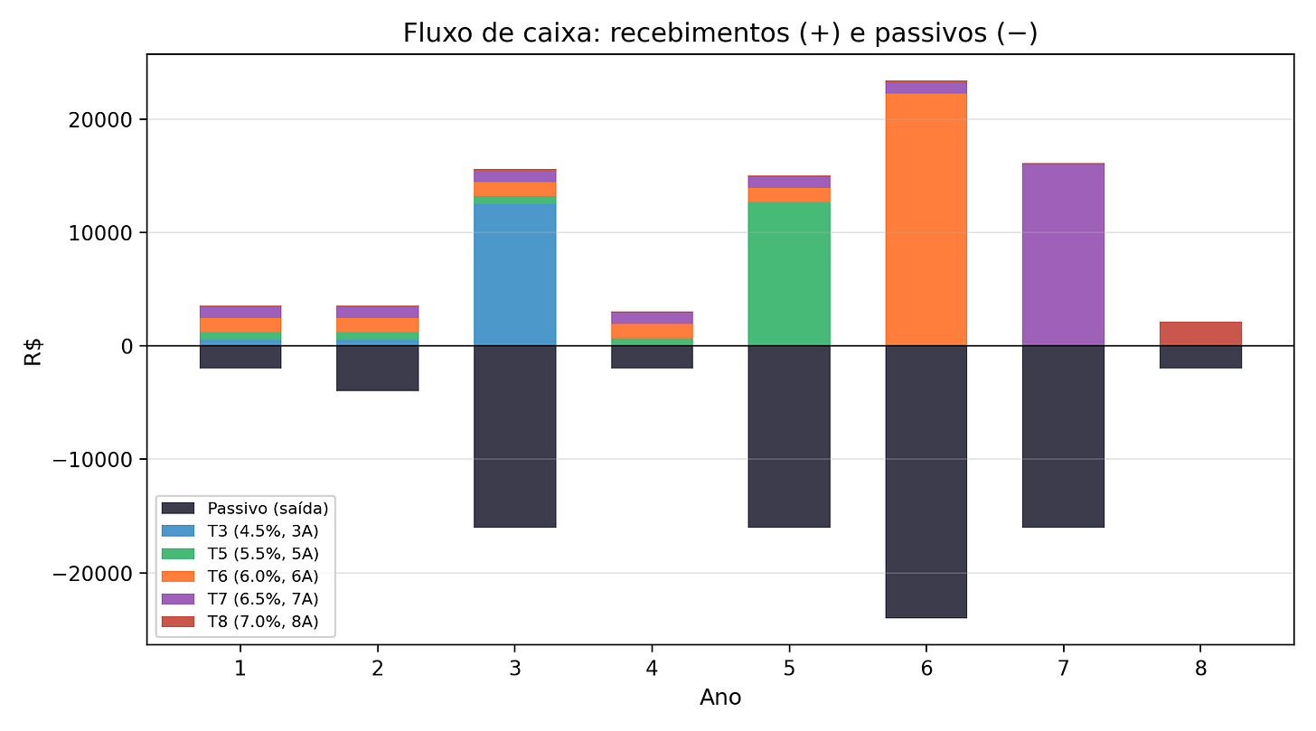 O gráfico de fluxo de caixa mostra a contribuição de cada título por ano. Nos anos de vencimento, o principal devolvido aparece como barra expressiva; nos demais, apenas os cupons contribuem. A linha preta indica o passivo a cobrir.