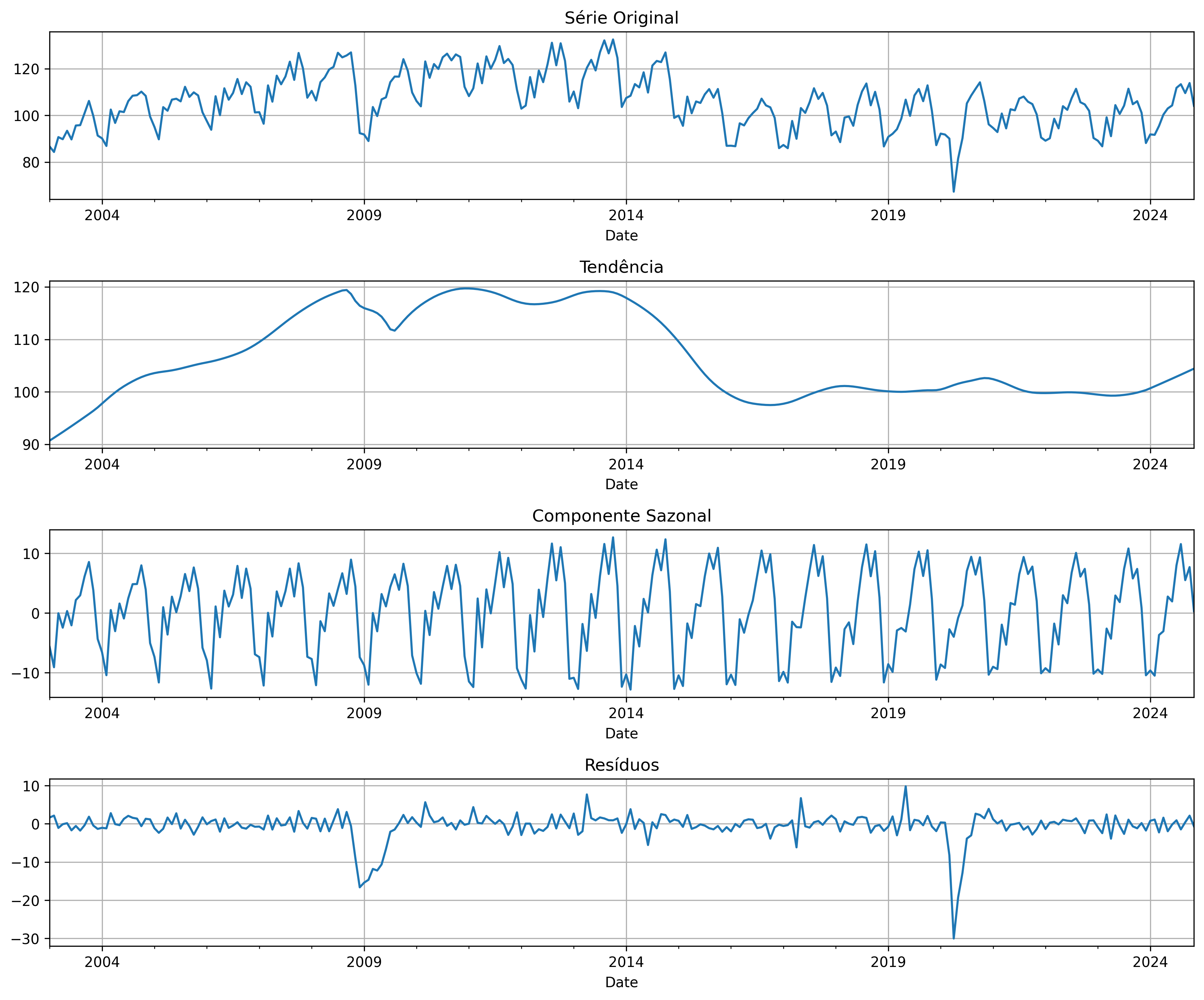 A decomposição STL (Seasonal-Trend Decomposition using LOESS) é uma técnica para dividir uma série temporal em três componentes principais: tendência, sazonalidade e resíduos. A tendência reflete a direção geral da série ao longo do tempo, capturando variações de longo prazo, enquanto a sazonalidade representa padrões recorrentes em intervalos regulares, como flutuações anuais ou mensais previsíveis. Já os resíduos correspondem à parte imprevisível ou aleatória, que não pode ser explicada pela tendência ou sazonalidade, como eventos únicos ou erros.