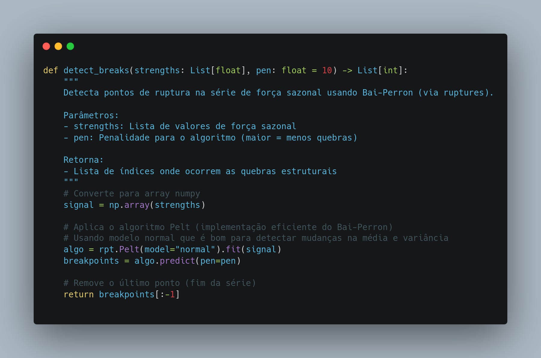 Mudanças abruptas na força sazonal podem sinalizar transições econômicas ou eventos inesperados. Para identificá-las, a função detect_breaks implementa o teste Bai-Perron, introduzido por Jushan Bai e Pierre Perron em estudos sobre mudanças estruturais em modelos de regressão linear. Originalmente, esse método foi aplicado para analisar dados macroeconômicos e financeiros, onde alterações súbitas no comportamento de variáveis podem afetar projeções e tomadas de decisão.