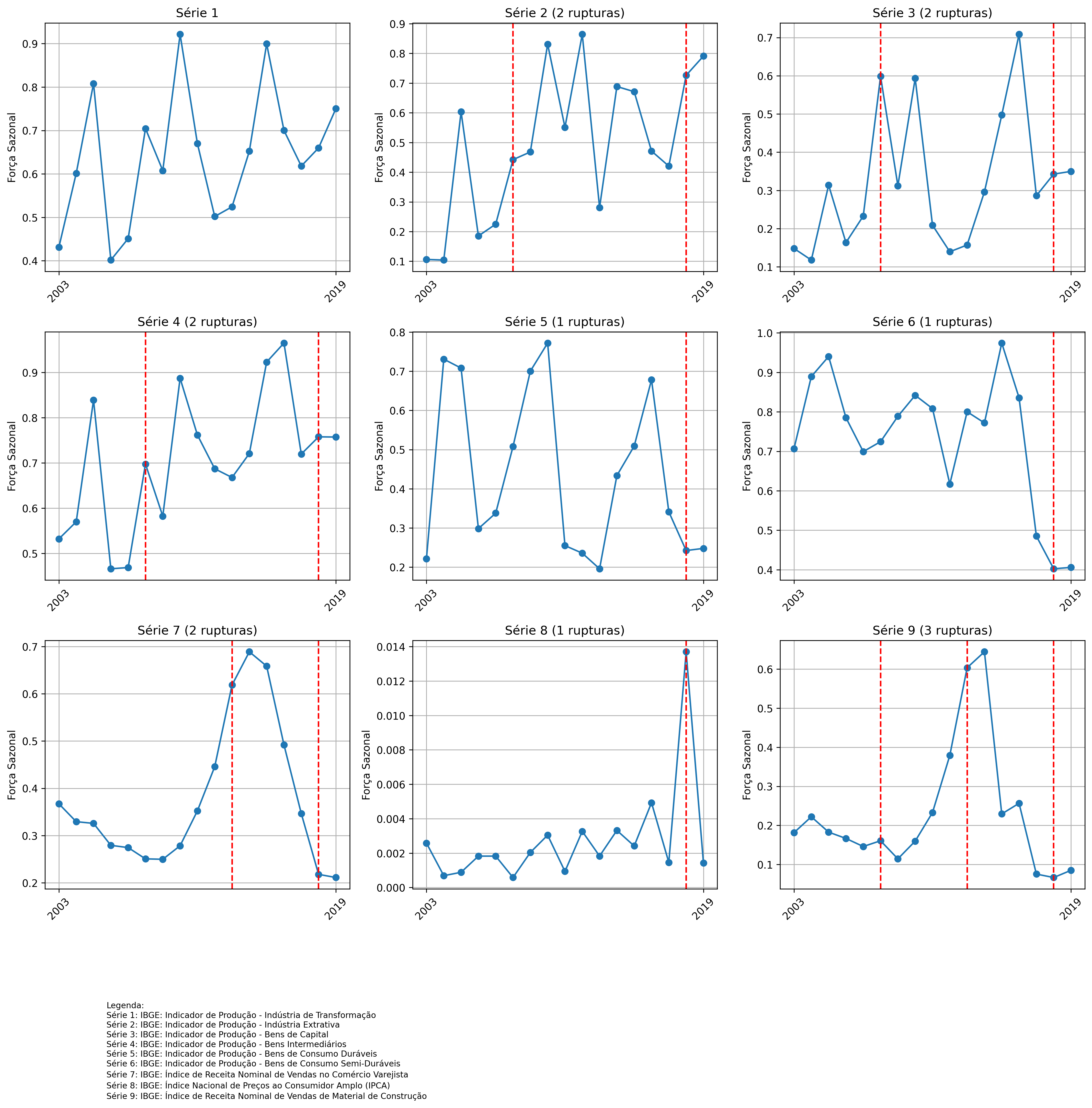 Os gráficos mostram a evolução da força de sazonalidade em nove séries distintas, com uma ou mais rupturas (linhas verticais vermelhas) ao longo do tempo. Observa-se que algumas séries apresentam oscilações marcantes, indicando períodos em que a sazonalidade se intensifica ou se enfraquece de forma clara. Na Série 7 (Índice de Receita Nominal de Vendas no Comércio Varejista), por exemplo, há um pico acentuado em torno de “2009”, que representa 2009-2013, seguido de forte queda, sugerindo mudanças estruturais significativas no comportamento sazonal. Já a Série 8 (IPCA) chama a atenção por ter valores de sazonalidade relativamente baixos durante quase todo o período, mas exibe um salto abrupto próximo a 2018, que representa 2018-2022.
