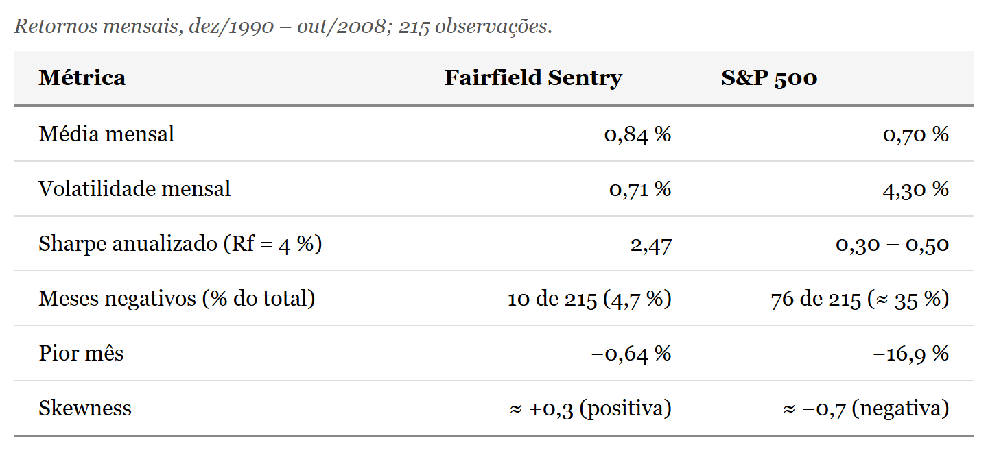 Madoff entrega 120% do retorno do S&P 500 com apenas 16% do risco do índice, sendo certo que nenhuma estratégia conhecida de long-short sobre o mercado americano chega perto desse perfil. Embora a literatura tenha catalogado outras bandeiras vermelhas de natureza de governança, entre elas custodiante interno, auditor desconhecido e ausência de staff de front-office, o ponto estatístico já seria suficiente por si só. Getmansky, Lo e Makarov (2004), por sua vez, mostraram que a série exibia autocorrelação serial positiva da ordem de 0,3 a 0,5, valor incompatível com uma estratégia executada sobre opções líquidas de S&P 100 e típico de smoothing artificial de retornos.