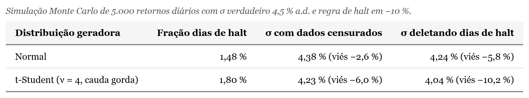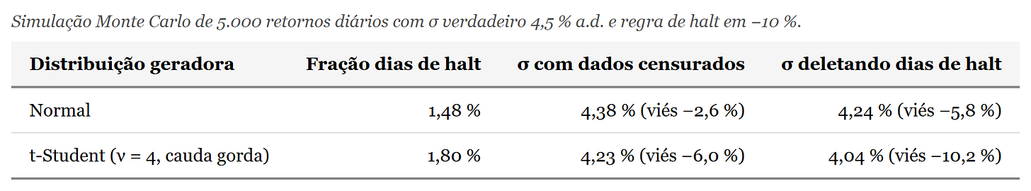 A simulação reproduz o fenômeno com parâmetros calibrados em regime de stress. Geramos cinco mil retornos diários sob volatilidade verdadeira de 4,5% ao dia, consistente com o Ibovespa em março de 2020, e aplicamos a regra da B3 censurando em −10%. Sob normalidade, a fração esperada de dias de halt é baixa, e o viés resultante também é modesto. Sob cauda gorda, modelada por uma t-Student com quatro graus de liberdade rescalada para o mesmo desvio padrão, o mesmo procedimento produz resultado substancialmente pior, próximo dos dez por cento. Os números da simulação ficam assim: