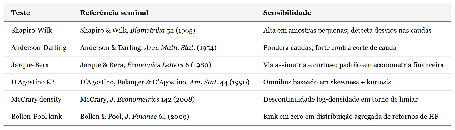 Para o problema específico de fraude em fundos, contudo, importa menos a escolha entre testes de normalidade do que detectar manipulação por descontinuidade em torno de zero, que é a assinatura típica de retornos maquiados. Nesse caso, o teste de McCrary (2008) é o mais preciso, pois estima a densidade logarítmica à esquerda e à direita de um limiar c: