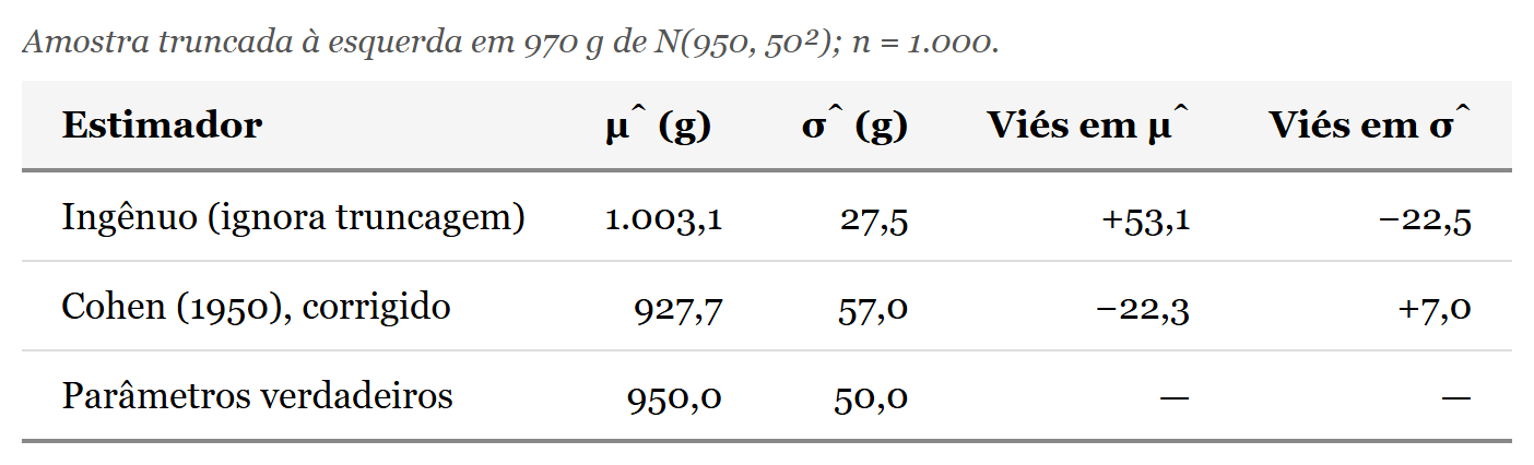 O terceiro termo é a correção. Ele pune o estimador por cada observação que não foi vista, impedindo que média e variância amostrais sejam tomadas como se descrevessem o processo original. Para ilustrar a magnitude do viés, simulei cinquenta mil pesos de pão sob N(950, 50²), trunquei em 970 gramas (o limiar do padeiro desconfiado, um tanto abaixo do da parábola) e apliquei os dois estimadores. Os resultados aparecem na tabela abaixo.