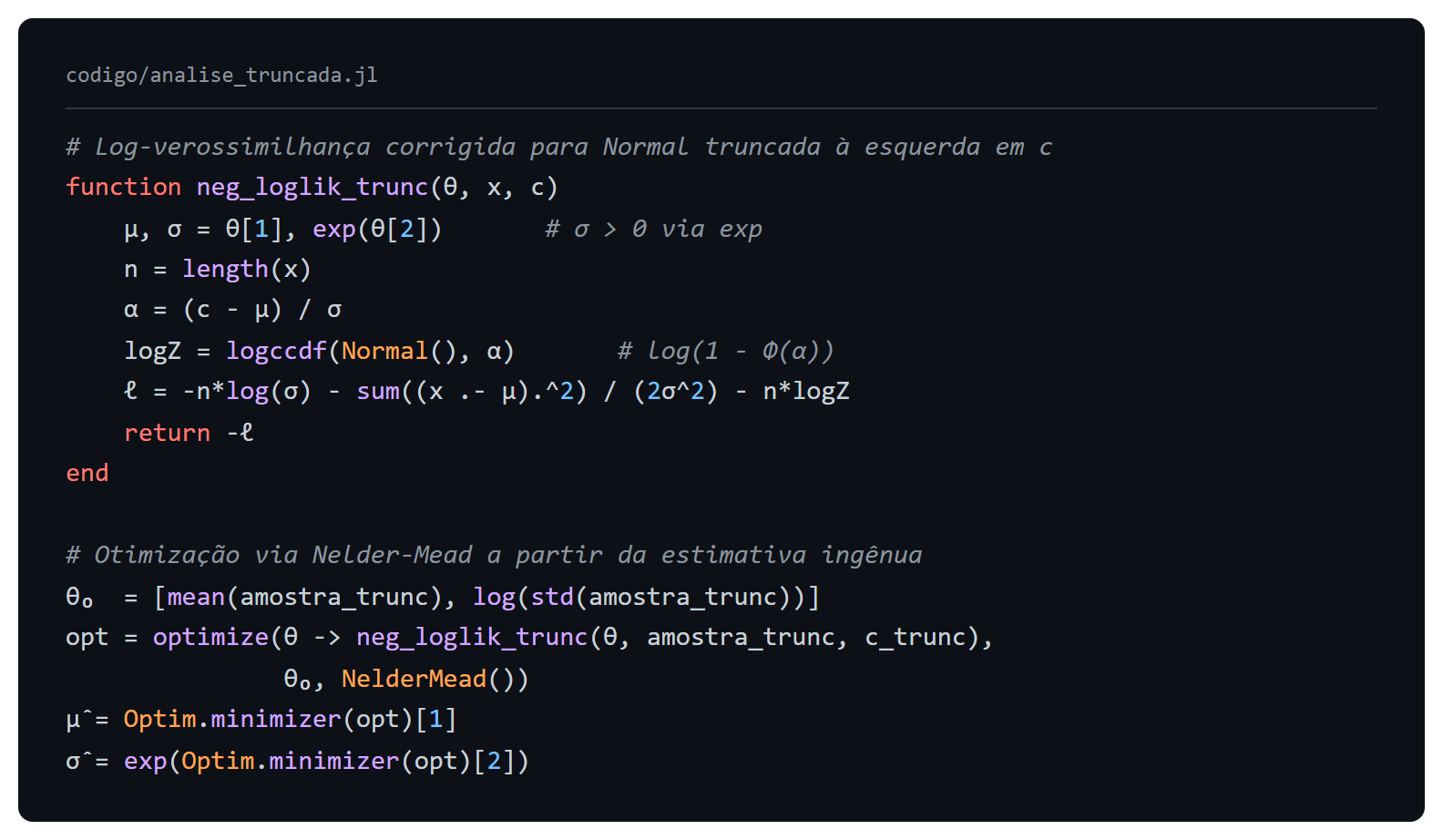 A implementação em Julia segue diretamente a equação acima. A biblioteca Distributions.jl oferece a distribuição truncada como primitiva, e Optim.jl resolve o problema de otimização sem qualquer customização numérica.
