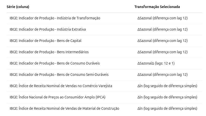 Essas transformações refletem padrões típicos de séries econômicas mensais. Por exemplo, todas as séries de produção industrial exibiram forte sazonalidade, justificando o uso de diferença sazonal. A série de bens de consumo duráveis demandou uma diferenciação adicional após a sazonal, indicando presença de tendência residual. Já as séries nominais (comércio, IPCA e material de construção) apresentaram variância proporcional ao nível, o que motivou a transformação logarítmica, seguida de diferenciação para remover tendência.