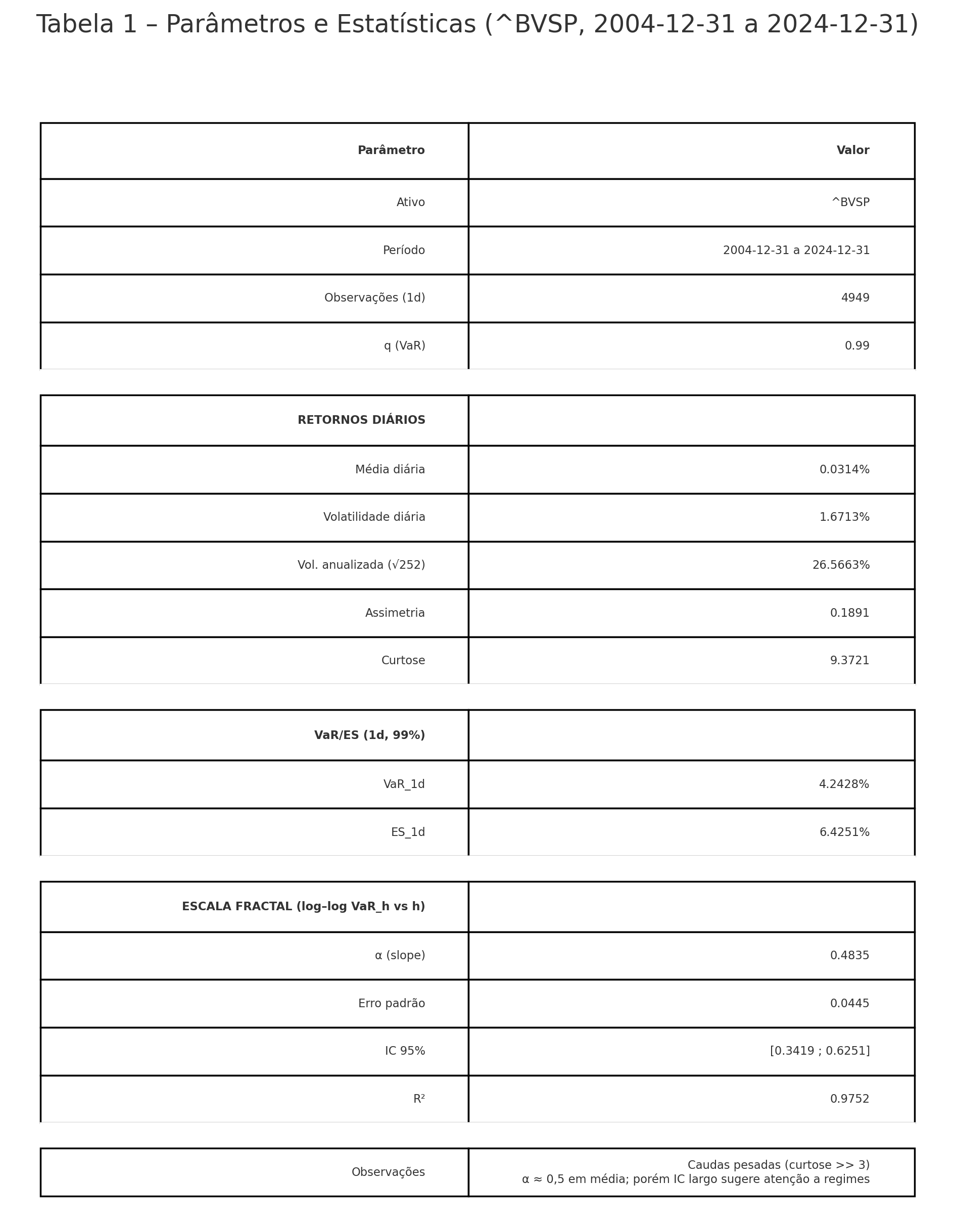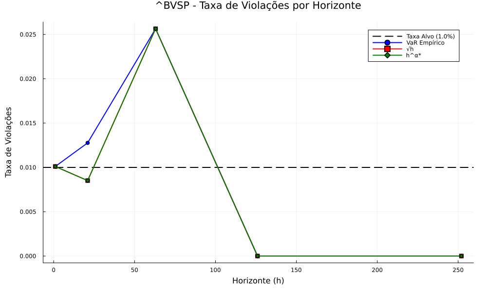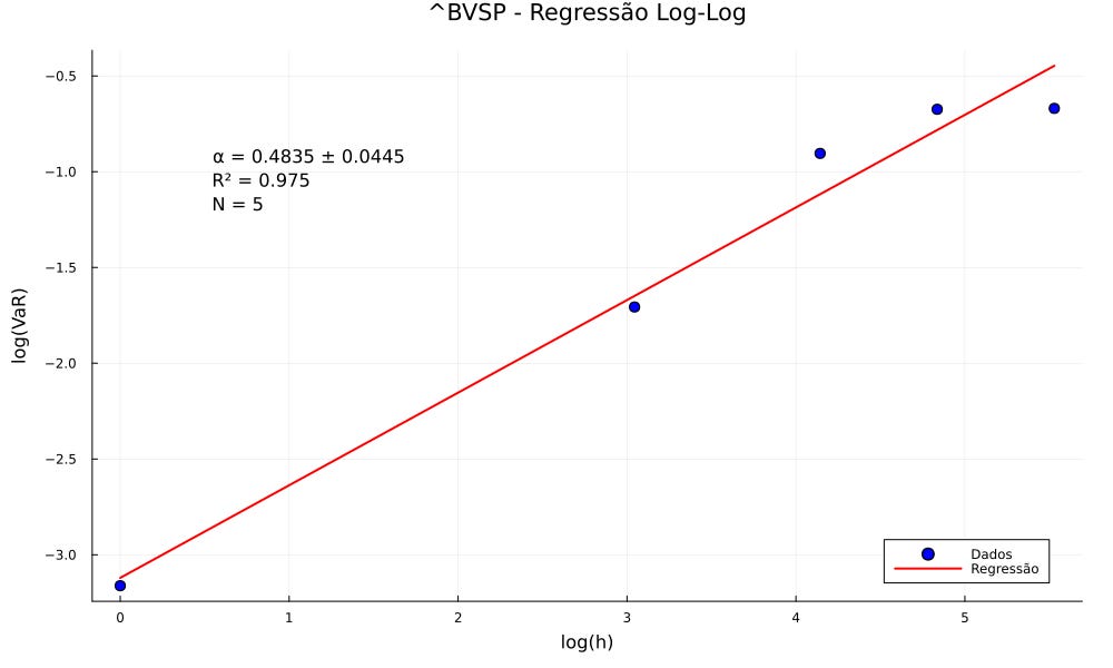 Este artigo usa o código em Julia do repositório PQ Fractal Risk Scaling para analisar o Ibovespa (^BVSP) entre 2004-12-31 e 2024-12-31. Apresentamos a seguir como obter e como interpretar os resultados, e discutimos se um α≈0,5 obtido nos autoriza a escalar à vontade. A resposta curta é não: mesmo quando o α encontrado parece browniano, há armadilhas de amostra, curvatura por horizonte e mudança de regime que podem comprometer a cobertura do VaR ao extrapolar para janelas longas (KUPIEC, 1995; CHRISTOFFERSEN, 1998; MCNEIL; FREY; EMBRECHTS, 2015).