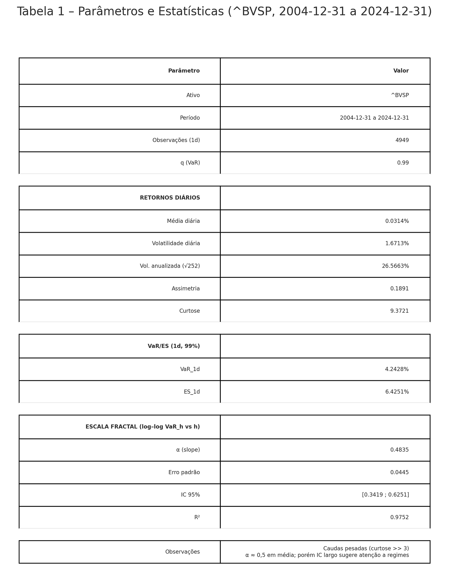 Resumo estatístico e parâmetros fractais: retorno e volatilidade, assimetria/curtose, α, IC e R2 e VaR(1);