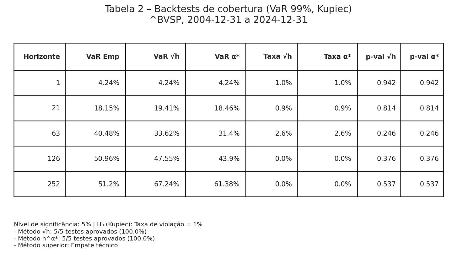 Os backtests de Kupiec no VaR 99% mostram um quadro nuançado. Para 21 dias, as taxas de violação ficaram ~0,9% tanto para raiz quanto h elevado a α, com p-valores elevados: ambos adequados. Já em 63 dias, a taxa observada foi 2,6%, acima da meta de 1% (subcobertura), para os dois métodos; o p-valor (0,246) impede rejeitar a hipótese nula, mas sinaliza que a curva empíricaVaR 63d (40,48%) excede sensivelmente a regra da raiz (33,62%) e a regra de α (31,40%). Em 126 e 252 dias, não houve violações no período (amostra efetiva pequena em blocos não sobrepostos), o que torna os testes pouco informativos apesar de p-valores confortáveis.