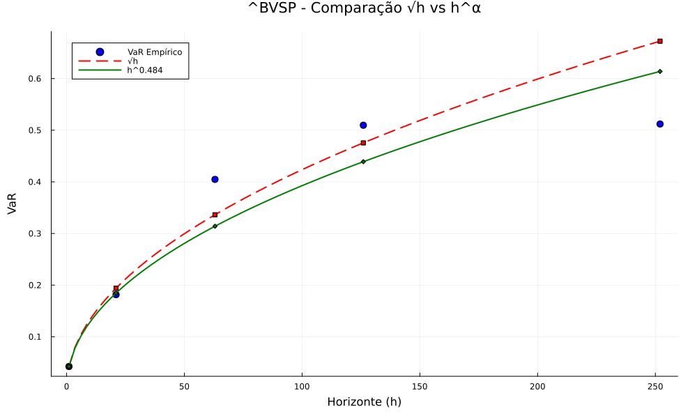 Na prática, séries financeiras apresentam caudas pesadas e volatilidade em clusters (CONT, 2001), o que pode distorcer substancialmente o escalonamento por raiz de h. (MANDELBROT, 1963; MCNEIL; FREY; EMBRECHTS, 2015). Uma alternativa mais aderente aos dados é estimar empiricamente um expoente de escala α via regressão log–log de log VaR(h) contra log(h), permitindo capturar desvios sistemáticos em relação a 0,5 (raiz quadrada).