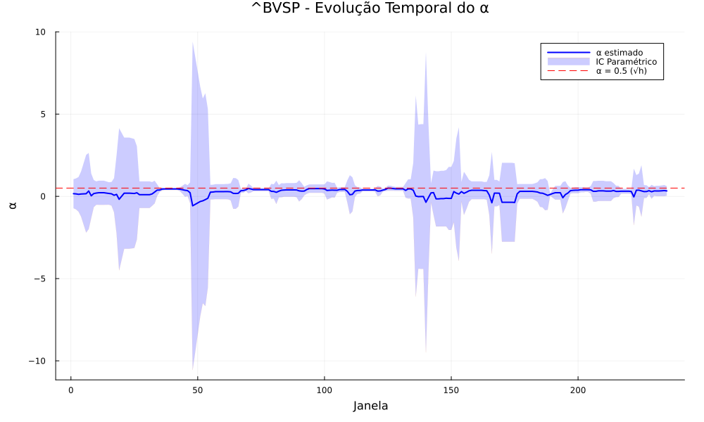 série temporal do rolling de α(t) com bandas de confiança bootstrap;