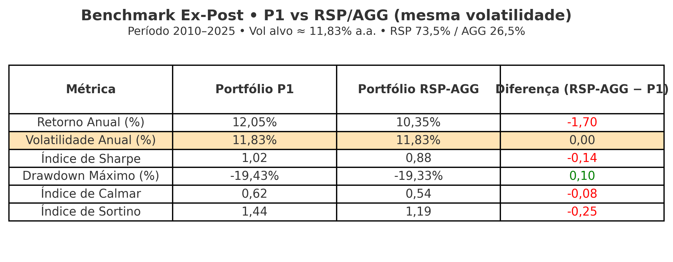 Para julgar a atratividade prática da postura defensiva, comparamos P1 a um mix simples de ETFs calibrado para ter mesma volatilidade da carteira P1. Foram utilizados os ETFs RSP(Invesco S&P 500 Eql Wght ETF) e AGG (iShares Core US Aggregate Bond ETF). Em análise ex-post, o mix fixo que obteve mesma volatilidade da carteira P1 no período (11,83% ao ano) foi composto de 73,5% de RSP e 26,5% de AGG.