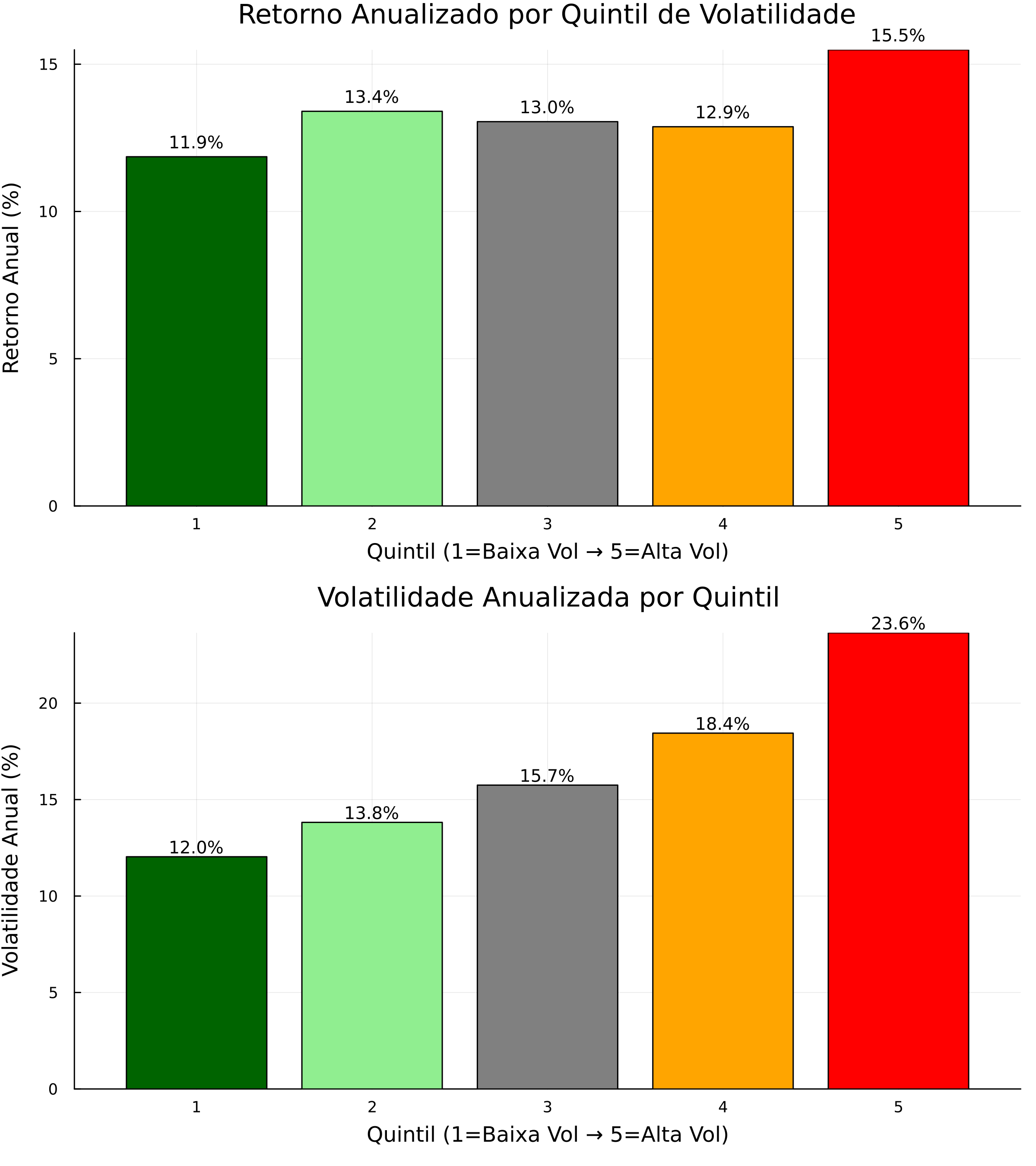 Investigamos a anomalia de baixa volatilidade no S&P 500 entre 2010 e 2025 com uma montagem point-in-time, evitando viés de sobrevivência. A cada mês, as ações foram ranqueadas pela volatilidade histórica de 12 meses, formamos carteiras por quintis (de P1, mais defensiva, a P5, mais arriscada), em pesos iguais e com rebalanceamento mensal. A base veio do Stooq com complemento da API do Tiingo, garantindo cobertura ampla do universo do índice. O código utilizado está em PQ Novy-Marx. Os resultados obtidos estão na tabela a seguir.