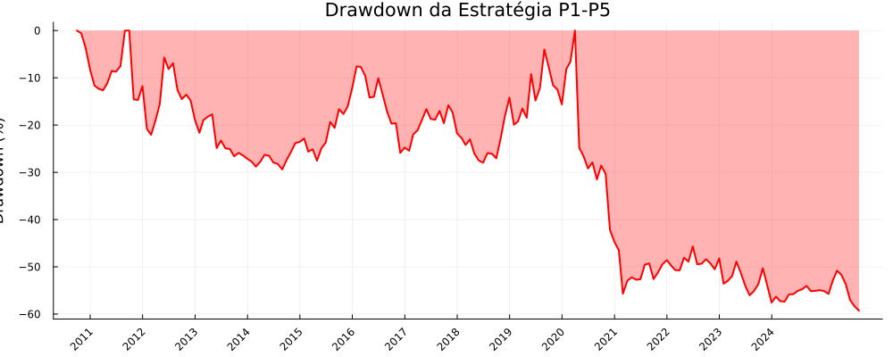 A exploração direcional da anomalia, que corresponde a comprar baixa vol e vender alta vol, não funcionou no agregado. O fator foi neutro até meados da década passada e degringolou depois, terminando o período com retorno anual negativo (≈-3,6% a.a.). O ponto de inflexão foi a pandemia: o tombo de março de 2020 inicialmente ajudou quem estava vendido em alta volatilidade, mas a recuperação explosiva imediatamente seguinte inverteu o sinal. Em abril, o quintil mais arriscado saltou mais de um terço no mês, enquanto o quintil defensivo avançou bem menos da metade disso, impondo ao fator uma perda mensal próxima de 25 pontos percentuais e um drawdown histórico (≈-59%) difícil de recuperar nos anos seguintes. Abaixo, a figura expressa o drawdown da estratégia P1-P5.