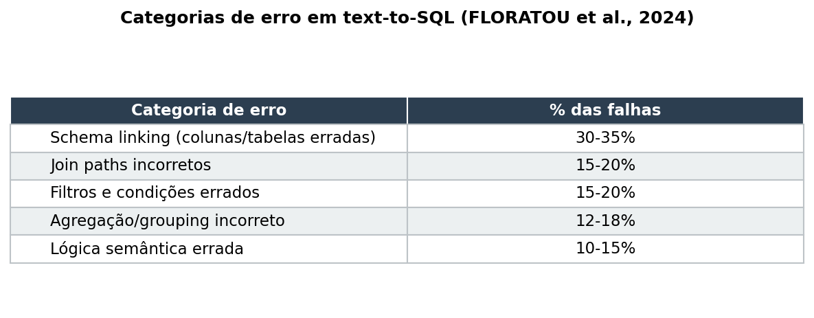 Uma análise sistemática de erros (FLORATOU et al., 2024) identificou as principais categorias de falha: