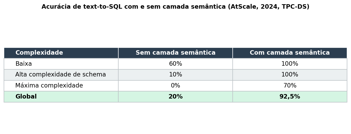 Em 2024, a AtScale publicou um benchmark usando o dataset TPC-DS com 40 perguntas de negócio que quantifica esse ganho (ATSCALE, 2024):